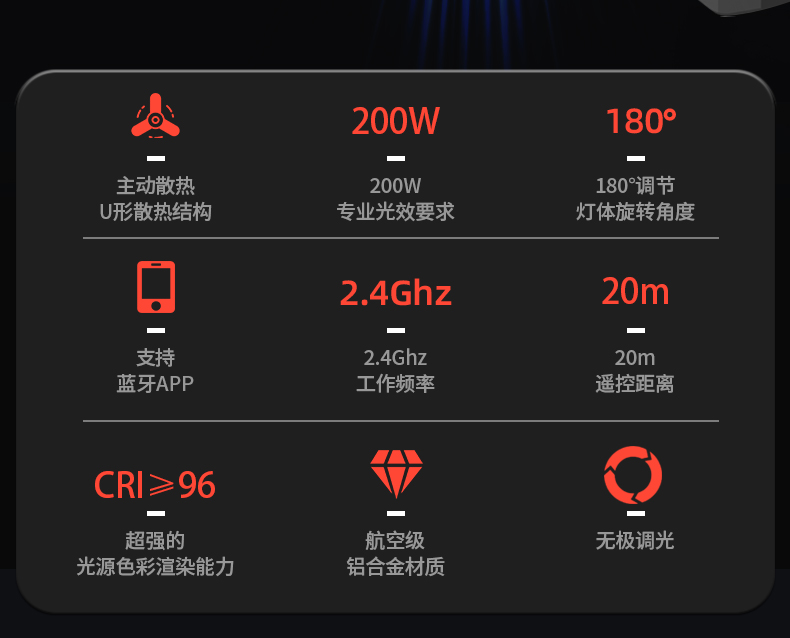 功耗:215W;; 色溫:5600K+200K; CRI(顯色指數(shù):≥96; TLCI:≥96; CQS:≥95; 工作電流:2.5A; 工作電壓:AC160~240V50/60Hz; 散熱方式:主動(dòng)散熱; 工作頻率:2.4GHz; 群組:有; 遙控距離:≤30m; 藍(lán)牙距離:2.4Ghz《20米; 亮度調(diào)節(jié):5%-100%; 燈體旋轉(zhuǎn)角度:180°調(diào)節(jié); 電池供電:交流供電; 箱包承重:無(wú)箱包; 是否支持藍(lán)牙:自帶; APP:有